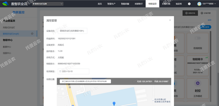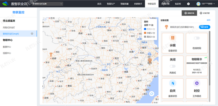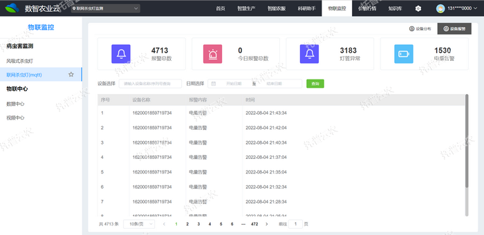 2、風(fēng)吸式茶園殺蟲燈可通過Web端、APP遠程控制,一個賬戶可遠程控制多臺不同編號的設(shè)備,遠程了解設(shè)備地理位置、設(shè)備編號、基地名稱、設(shè)備工作狀態(tài)、信號強度等設(shè)備信息。